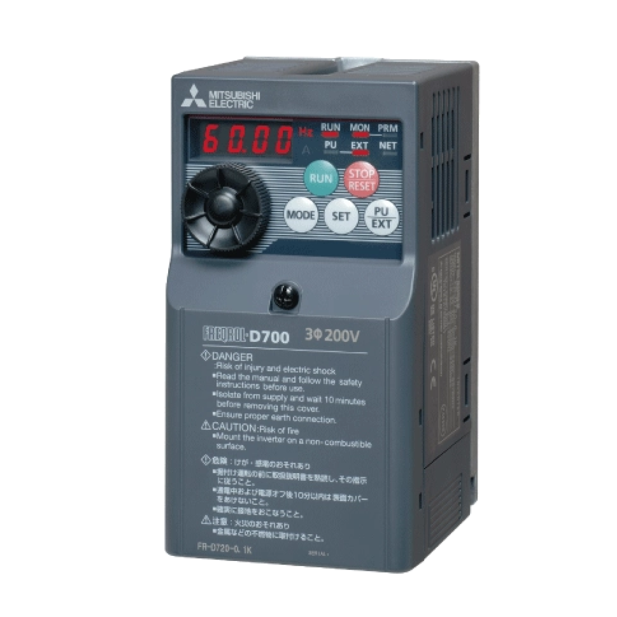 La serie D700 de Mitsubishi es una familia de variadores de frecuencia, reconocida por su confiabilidad y eficiencia en aplicaciones de control de motores. Este variador es adecuado para motores de baja potencia, proporcionando un control preciso y eficiente de la velocidad.